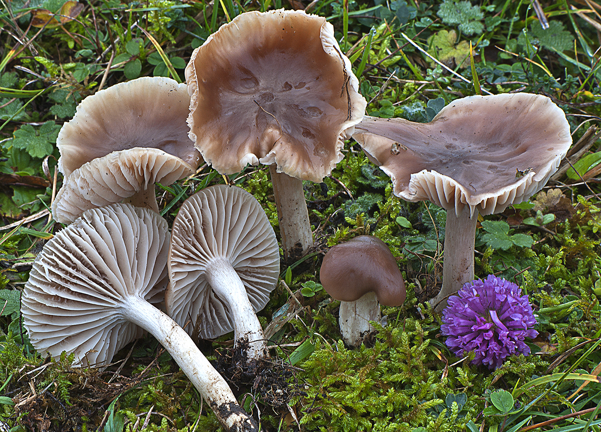 Caracteres macroscópicos. Píleo de 30-70 mm de diámetro, convexo, después plano-convexo incluso algo deprimido, umbonado, ocasiones fisurado; margen delgado, ondulado, excedente; superficie pileica un poco lubrificada en tiempo húmedo, lisa, higrófana, débilmente estriada por transparencia, de color pardo-rosado, con tonos violáceos, marrón oscuro sobre todo en el centro, decolorándose en tiempos eco en tonos ocre-marrón. Láminas de adnatas a muy decurrentes, anastomosadas, ventrudas, poco apretadas, grises, gris-blanquecino, gris-ocráceo, en algunos casos con reflejos rosados. Estípite de 50-90 × 5-10 mm, cilíndrico, atenuado hacia la base, hueco en la madurez, superficie longitudinalmente fibrillosa, lisa, blanco-grisácea. Contexto firme, fibroso, higrófano, blanquecino; olor suave a harina, sabor poco destacable.