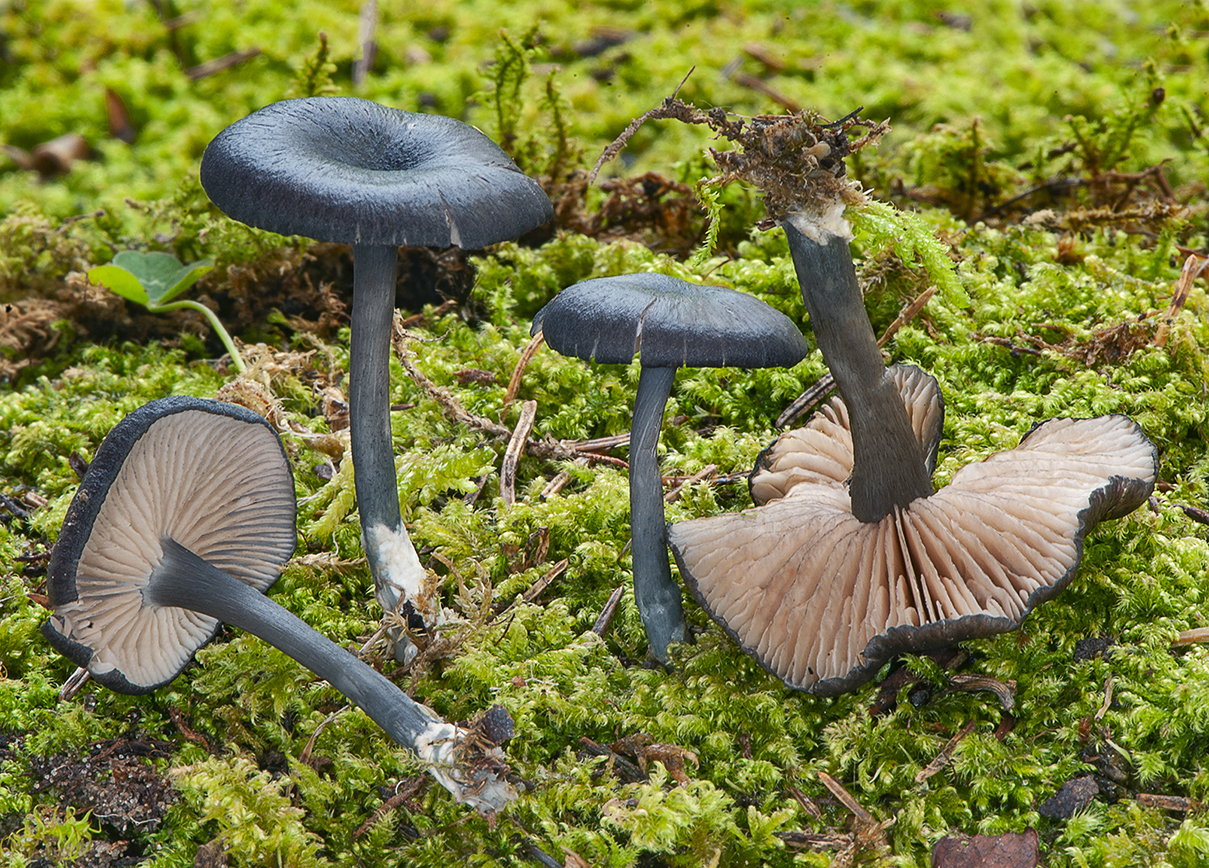 Caracteres macroscópicos. Píleo de hasta 40 mm de diámetro, primero cónico convexo, después plano convexo finalmente deprimido a umbilicado al centro; margen primero involuto y después incurvado, ni higrófano ni estriado por transparencia; superficie pileica separable, primero tomentosa, después finamente escuamuloso hacia el centro y fibrilloso hacia el margen, de color más o menos uniforme en azul negro oscuro, gris azul oscuro o azul oscuro violáceo. Láminas no muy apretadas, adnatas, emarginadas o un poco decurrentes, de color primero blanquecino o azul oscuro en los basidiomas inmaduros, rosa gris en la madurez; arista denticulada con el borde azul negro de forma irregular. Estípite hasta 20-60 × 2-5 mm, cilíndrico o comprimido, de color azul oscuro, azul violáceo, en general del color del píleo o un poco más claro, palideciendo en la mitad inferior, base blanquecina. Contexto poco consistente, gris azul bajo la pileipellis y en el estípite, olor un poco aromático, sabor poco apreciable.