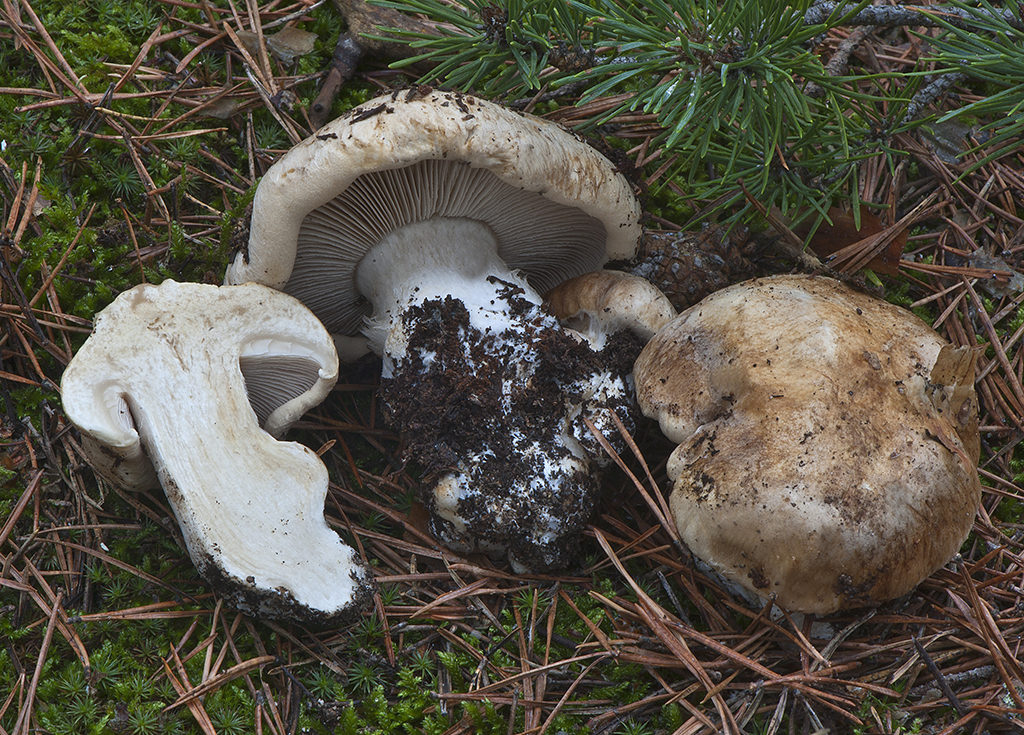Caracteres macroscópicos. Píleo de hasta 70 mm de diámetro, primero globoso, después convexo a extendido; margen incurvado, grueso. Superficie piléica separable, poco viscosa, pronto seca, sin fibrillas innatas, dulce; de color blanquecino, blanco-crema, ocre en la madurez. Láminas medianamente apretadas, desiguales, con numerosas lamélulas, estrechas, adnatas, arista aserrada; de color blanco, después cremas. Estípite hasta 60×20 mm, claviforme-bulboso, pero no marginado, lleno, fibrilloso; de color blanco o blanquecino; cortina fugaz, blanquecina. Contexto espeso, firme, blanquecino, un poco rosada hacia el estípite; con olor débil harinoso y sabor dulce.