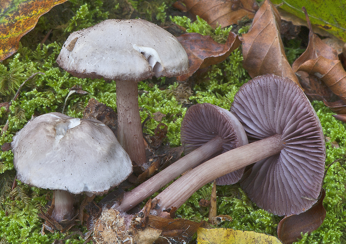 Caracteres macroscópicos. Basidiomas de tamaño medio que, fructifican de forma aislada. Píleo de 20-50 mm de diámetro, primero hemisférico a campanulado, después plano convexo; margen delgado, agudo, surcado por transparencia; superficie pileica, mate, higrófano, glabro, un poco viscido en tiempo húmedo, de color gris-lila, lila-rosa, crema-lila, más coloreado en tiempo húmedo y lila-blanquecino en seco, con tonos crema-ocráceo en el disco. Láminas espaciadas, ventricosas, adnatas o a penas decurrentes por un diente, lisas o trasversalmente venosas, de color gris-lila, punteadas de púrpura oscuro; arista crenulada y coloreada de púrpura-oscuro. Estípite de 30-55 × 4-8 mm, cilindráceo, hueco, liso, de color crema-blanquecino, crema-amarillento o crema-lila, con fibrillas longitudinales ocre-púrpura. Contexto escaso, acuoso, blanquecino-grisáceo, más oscuro en la parte central del estípite olor y sabor a rábano.