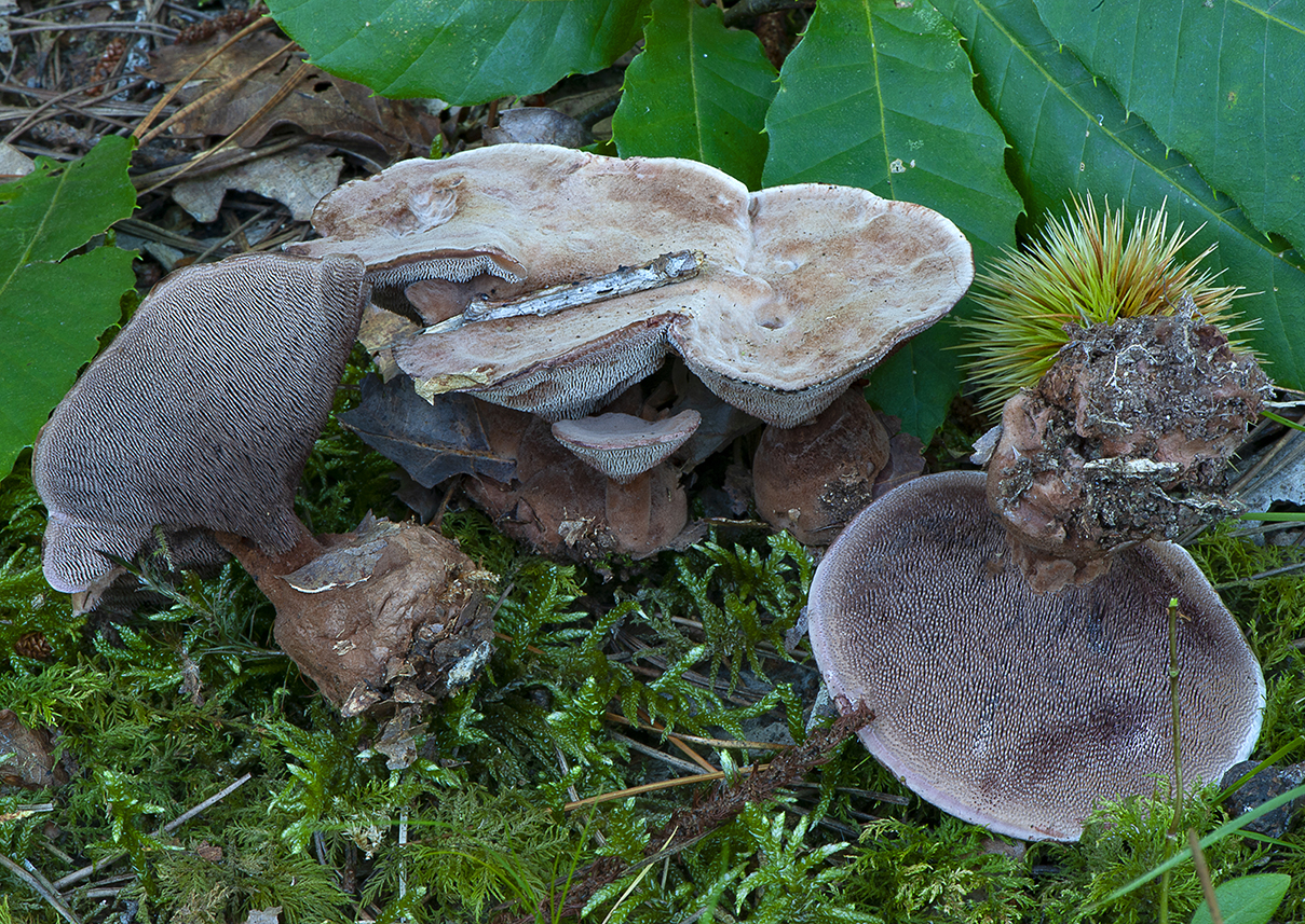 Caracteres macroscópicos. Basidiomas agrupados o en grupos más o menos extensos pero rara vez concrescentes, estipitados, de hasta 100mm de diámetro, extendido y asimétricos. Píleo de 30-60 mm, primero plano convexo, pronto extendido superficie pileica rugosa, vellosa o tomentosa, de color marrón claro a ocre marrón oscuro; margen ondulado, englobando restos vegetales, blanquecino, se mancha de pardusco al rozamiento. Himenóforo situado en la cara inferior del basidioma, formado por acúleos o espinas de hasta 5 mm, decurrentes, blanquecinos al principio, rojizo marrón en la madurez. Estípite de hasta 20-50 × 10-25 mm, corto, robusto, con la superficie afieltrado o tomentosa y cubierta de restos vegetales, de color pardo rojizo a pardo marrón. Contexto fibroso, coriáceo, zonado concéntricamente, rojo marrón oscuro; olor suave harinoso, sabor dulce.