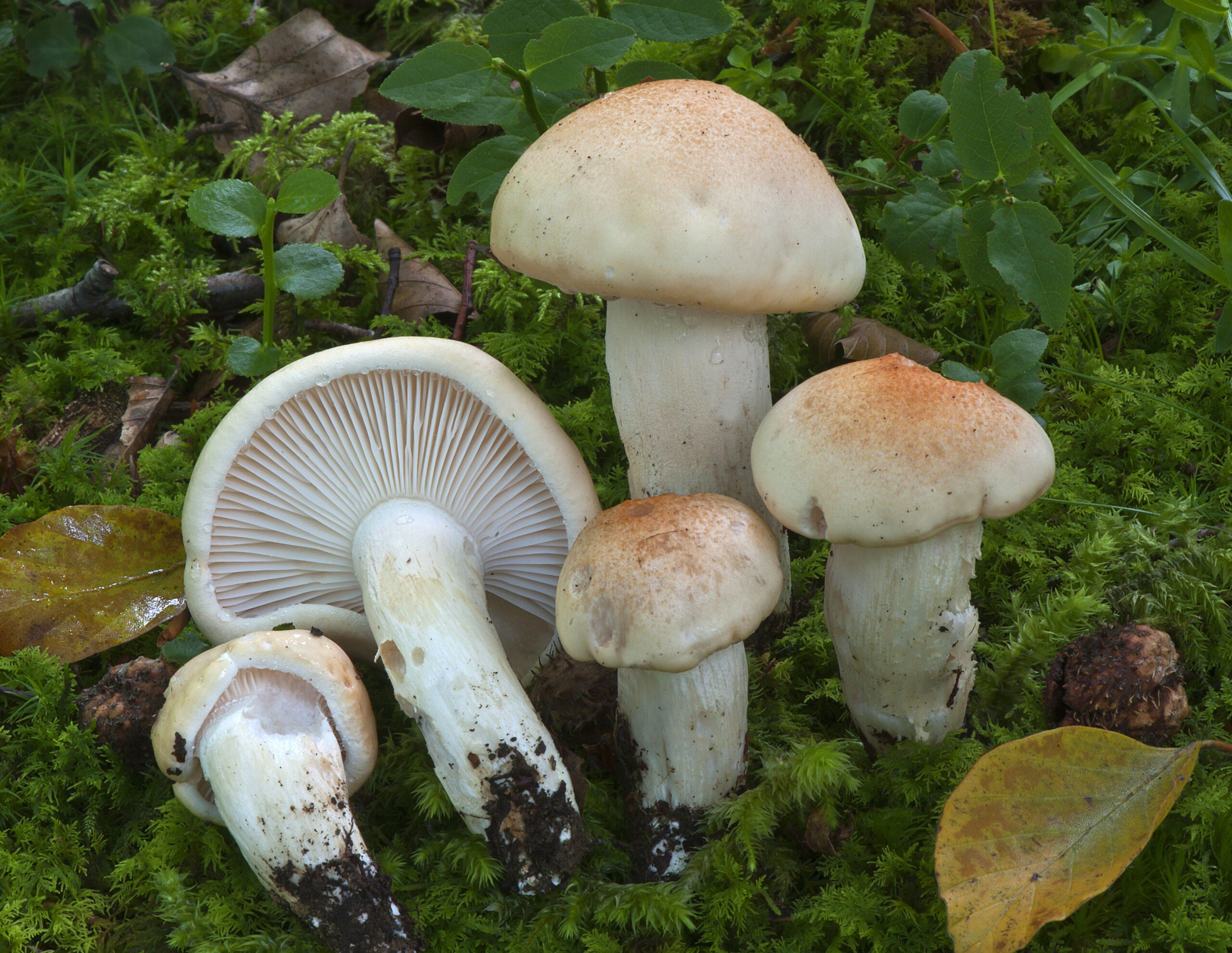 Caracteres macroscópicos. Píleo de 30-130 mm de diámetro, hemisférico, campanulado, después convexo, finalmente plano- convexo o incluso algo deprimido y ligeramente umbonado; margen grueso, involuto, ligeramente excedente; superficie pileica un poco viscida en tiempo húmedo, sedosa y mate en tiempo seco, blanquecino-anaranjado o crema-rosado, crema-blanquecino hacia la periferia, más oscuro en el disco. Láminas espaciadas, gruesas, de adnatas a brevemente decurrentes, anastomosadas, blanquecinas a crema-blanquecino. Estípite de 40-100 × 10-20 mm, cilíndrico, pero adelgazándose hacia la base, curvado, fibrilloso longitudinalmente, suavemente furfuráceo y exudando gotas acuosas en la parte alta, crema-blanquecino. Contexto firme, fibrilloso en el estípite, blanquecina, rosado bajo la pileipellis; olor similar a la flor de jacinto, sabor dulce.