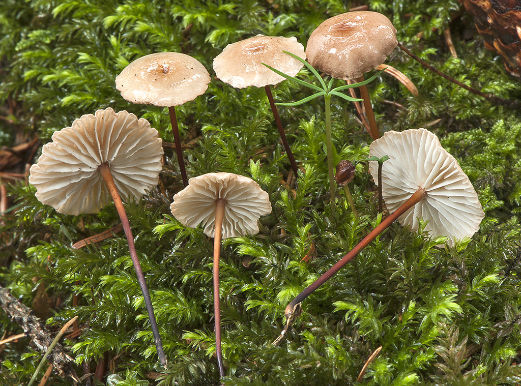 Caracteres macroscópicos. Píleo de hasta 20 mm de diámetro, primero convexo, después plano convexo a extendido, incluso un poco deprimido al centro, margen agudo, delgado, ondulado, superficie piléica mate, lisa o un poco arrugada, de color ocre rosado, crema ocráceo, débilmente higrófano, blanquecino en la madurez y en tiempo seco. Láminas muy espaciadas, estrechas, desiguales, ventricosas, adnatas redondeadas, de color blanquecino a crema, arista floconosa, concolor. Estípite de hasta 60 x 2 mm, cilíndrico, fistuloso, liso, cartilaginoso, tenaz, de color rojizo marrón, rojizo marrón negruzco hacia la base. C0ntexto membranosa, tenaz, blanquecina, olor neto de ajo, sabor ligero a ajo.
