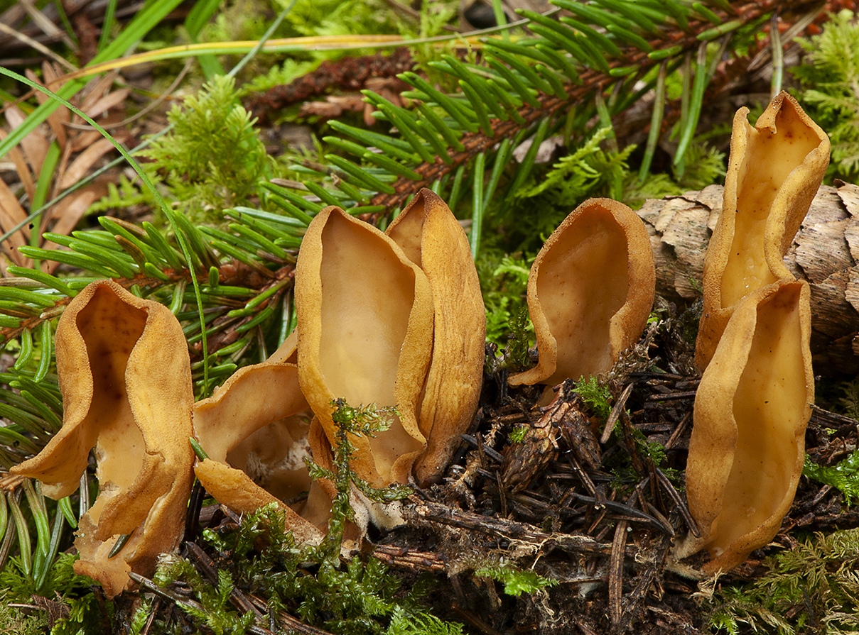 Caracteres microscópicos. Ascomas gregarios, en forma de apotecios de hasta 50 mm de altura y 20 mm de anchura, en forma de oreja, con el ápice puntiagudo, con los bordes muy próximos entre sí en los ascomas jóvenes, la división lateral baja hasta el estípite. Superficie externa arrugada verticalmente, de color marrón amarillo u ocre naranja, cubierta de finas verrugas más oscuras. Superficie interior o fértil lisa, ocre-amarillo pálido, ocre-naranja pálido. Estípite muy corto, cubierto de restos de micelio blanquecino. Contexto delgado, quebradizo, sin olor ni sabor destacables.
